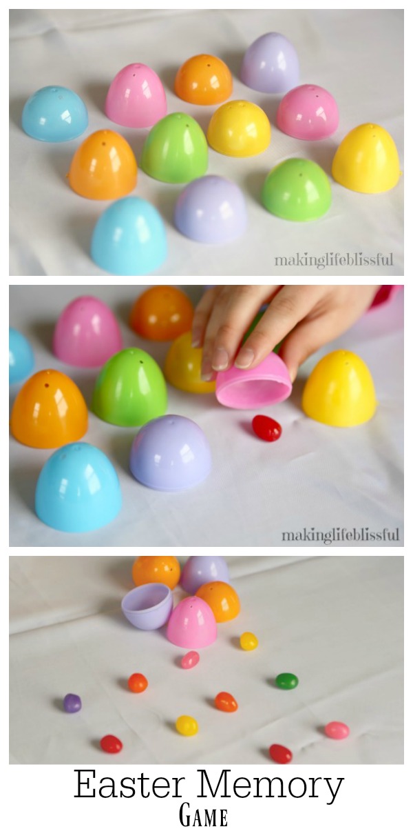 Easter Memory Match: Place the jelly beans in rows in the playing area. You can mix the colors up however you want. Use the plastic egg halves to cover each jelly bean. Let players take turns choosing 2 eggs at a time to uncover. If the jelly bean colors match then that player gets to eat those jelly beans and the eggs that were covering them are removed from the game. If they do not match, simply cover the 2 choices with eggs again and let the next player try. Play until all the jelly bean matches have been found.